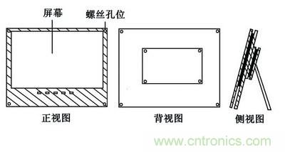 接著將這塊壓克力板切開為兩塊,分別用作前后面板。按照液晶屏幕的尺寸,在前面板上切開一個(gè)方形的口,而下方則留出稍寬一點(diǎn),并在上面留出按鈕的位置。接著根據(jù)前面板大小,將后面板進(jìn)行同樣的切割,不過(guò)用不著開口。有了前后兩塊面板,我們就可以使用螺絲將液晶面板固定在兩者的中間。