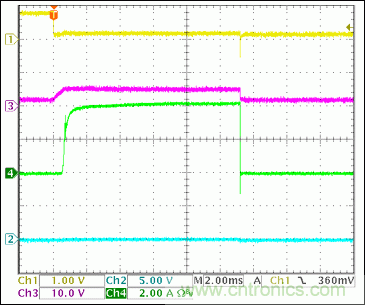 圖20. +12V過流關(guān)斷Ch1 = STAT3, Ch2 = VGATE (+12V), Ch3 = +12VOUT, Ch4 = IOUT(+3.3V) 0.5A/div