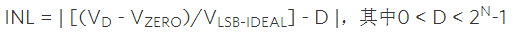 最佳直線方法通常被作為首選,因為它能產(chǎn)生比較好的結(jié)果。INL是在扣除了靜態(tài)失調(diào)和增益誤差后的測量結(jié)果,可用下式表示: