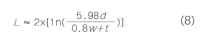 式中: L = 銅走線的寄生電感(nH); d = 銅走線和參考底面之間的距離(cm); w = 銅走線寬度(cm); t = 銅走線厚度(cm); x = 銅走線長度(cm)。