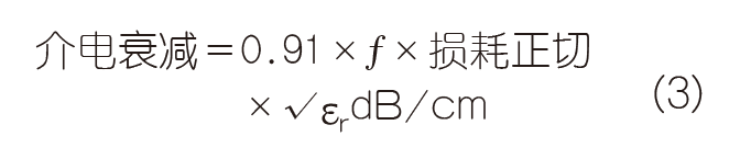 根據(jù)介電特性(例如損耗正切和介電損耗),印刷電路板基片介電材料可以分為3類。如表1表示,高損耗材料(如Nelco N4000-6)的損耗正切值超過0.02,介電常數(shù)超過4;中等損耗材料(如Isola FR408)的損耗正切值約為0.01,介電常數(shù)在3和4之間;低損耗材料(如Duroid 5870)的損耗正切值約為0.001,介電常數(shù)低于3。介電衰減與損耗正切和介電常數(shù)的平方根成正比,如公式3所示。