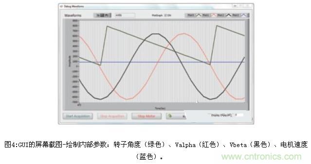 基于SmartFusion2 SoC FPGA的多軸電機(jī)控制解決方案通過USB連接至主機(jī)PC,并與圖形用戶界面(GUI)通信,進(jìn)行啟動/停止電機(jī),設(shè)置電機(jī)速度值和其他系統(tǒng)參數(shù),描繪多達(dá)四個系統(tǒng)變量,例如電機(jī)速度、電機(jī)電流和轉(zhuǎn)子角度(圖4)。
