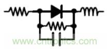 二極管高速導(dǎo)通截止時(shí),要考慮寄生參數(shù)。在二極管反向恢復(fù)期間,等效電感和等效電容成為一個(gè)RC 振蕩器,產(chǎn)生高頻振蕩。為了抑制這種高頻振蕩,需在二極管兩端并聯(lián)電容C或RC 緩沖網(wǎng)絡(luò)。電阻一般取10Ω-100Ω,電容取4.7pF-2.2nF。