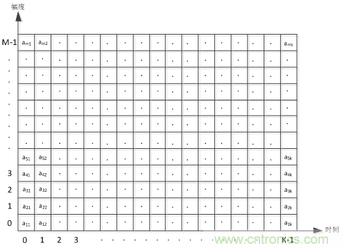 如圖1所示,三維波形數(shù)據(jù)庫可以看作是一個(gè)m×k的二維矩陣,m表示DSO屏幕的垂直分辨率(幅度),k表示DSO的水平分辨率(時(shí)間),而矩陣中元素amk表示幅度命中次數(shù),如圖2所示。