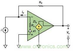 理想的CFA的輸入阻抗為零——其輸入端跨接完全短路——因?yàn)樨?fù)反饋信號(hào)為電流。相對(duì)地,理想的VFA的輸入阻抗則是無窮大,因?yàn)槠浞答佇盘?hào)為電壓。CFA檢測(cè)在其輸入端中流過的誤差電流,并形成等于Z與輸入電流之積的輸出電壓,其中,Z表示跨阻增益。須正確定義誤差電流的方向,以產(chǎn)生負(fù)反饋。與VFA中的A相似,在理想CFA中,Z接近無窮大。圖1所示基本原理展示了如何將理想的CFA配置成TIA,以便將來自理想電流源的電流轉(zhuǎn)換為輸出電壓。