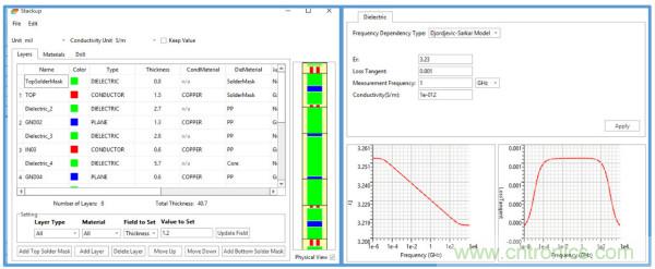 依據(jù)板廠提供的疊構(gòu)及材料信息在芯禾科技高速仿真工具中設(shè)置堆疊,或者在Cadence Allegro里將堆疊設(shè)置正確后,通過(guò)Hermes與ViaExpert導(dǎo)入Layout文件后,直接解析獲取堆疊信息。在芯禾科技高速仿真工具中,已支持介質(zhì)的單頻點(diǎn)與多頻點(diǎn)頻變模型。本文仿真使用的Djordjecvic-Sarkar模型,根據(jù)板廠提供的@1GHz的Dk與Df信息設(shè)置仿真參數(shù)。Layout工程師已按照板廠建議的差分線100ohm阻抗要求的線寬與間距布線。下面通過(guò)導(dǎo)入Layout文件進(jìn)行仿真驗(yàn)證當(dāng)前設(shè)計(jì)是否滿(mǎn)足阻抗要求,若不滿(mǎn)足,則需進(jìn)一步優(yōu)化。