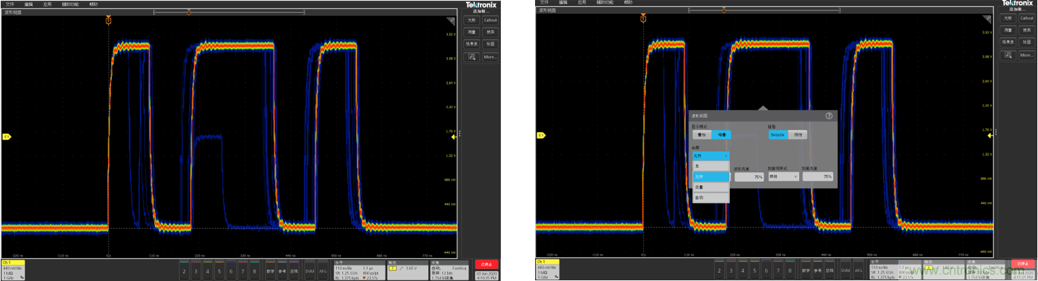 泰克新一代示波器的兩個(gè)功能可以快速發(fā)現(xiàn)異常信號。第一“Fast Acquision”快速捕獲功能。這個(gè)功能可以使示波器波形捕獲率能大大提升,最高實(shí)現(xiàn)捕獲50萬次波形/秒,發(fā)現(xiàn)快速異常信號概率提升100倍。以下是測試對比圖。