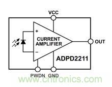 考慮使用多個高性能分立器件硬件成本過高,在性能達(dá)標(biāo)的條件下可以盡量選擇集成度高的器件。ADI旗下有一款產(chǎn)品(型號:ADPD2211),自帶24倍電流放大器使之擁有超高的靈敏度,省去了外置運(yùn)放;極好的脈沖響應(yīng)(典型帶寬達(dá)400KHz);超低電流噪聲(90fA/√Hz)。其內(nèi)部功能框圖如圖5。在輸出端加上采樣電阻到地,即可實(shí)現(xiàn)流壓轉(zhuǎn)換,省去眾多的外圍電路。其功能框圖如圖11。
