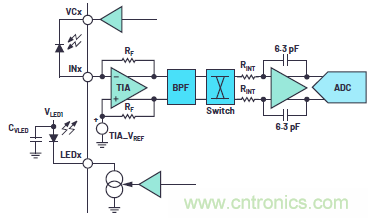 這款新AFE有兩個版本。一個具有I2C通信接口,另一個具有SPI端口。ADPD4100/ADPD4101的優(yōu)勢之一與光學測量有關。它出色的自動環(huán)境光抑制能力得益于在結合BPF的同步調制方案中使用可短至1 µs的脈沖,從而無需外部控制環(huán)路、直流電流減除或數(shù)字算法。使用高于1的抽取系數(shù)來提高輸出SNR。它有一個子采樣特性,允許選定時隙以比編程采樣速率低的采樣速率運行,從而節(jié)省功耗(功耗與采樣速率成比例)。它還有一個TIA上限檢測特性,當TIA輸入超出典型工作限值時,它會利用TIA輸出引腳上的電壓比較器來設置中斷位。