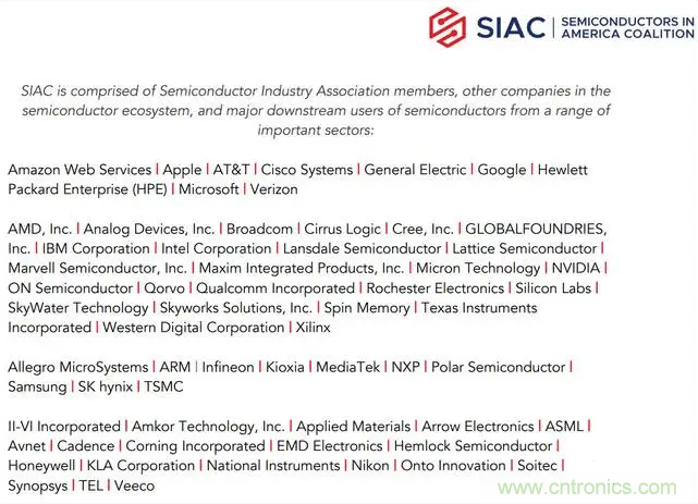5月11日,來(lái)自美國(guó)、歐洲、日本、韓國(guó)、臺(tái)灣地區(qū)的全球65家芯片制造商與上下游廠商共同宣布,組建「美國(guó)半導(dǎo)體聯(lián)盟」(Semiconductors in American Coalition,SIAC),成員基本覆蓋整個(gè)半導(dǎo)體產(chǎn)業(yè)鏈——包括蘋果、高通、英特爾等美國(guó)科技巨頭,臺(tái)灣地區(qū)的臺(tái)積電、聯(lián)發(fā)科等,也加入其中,支持美國(guó)推動(dòng)半導(dǎo)體制造與研發(fā)。