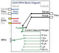 在Endurance或Retention測(cè)試中,由于是測(cè)量陣列長(zhǎng)時(shí)間、多脈沖下的可靠性特性,往往對(duì)Read電流的精度要求很高,用于精準(zhǔn)的描述阻變的動(dòng)力學(xué)過(guò)程,因此會(huì)用到1pA量程下0.01fA分辨率的源表或更高精度的皮安表進(jìn)行電流測(cè)試。因此脈沖電壓Set/Reset激勵(lì)和直流Read電流讀取需要在同一個(gè)端口進(jìn)行。4225-RPM是一款集成了電流放大、通道切換的模塊,無(wú)需更換前端探針或連線可以輕松的實(shí)現(xiàn)不同類(lèi)型信號(hào)的測(cè)試。