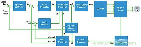 這款I(lǐng)P套件還包括所有基礎(chǔ)構(gòu)件,包括Clarke和Park轉(zhuǎn)換、用于控制環(huán)路反饋的比例積分(PI)控制器,以及空間矢量PWM(SVPWM)。