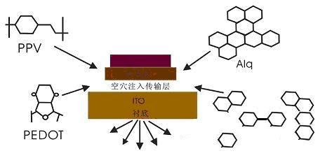 OLED的發(fā)光機理和過程是從陰、陽兩極分別注入電子和空穴,被注入的電子和空穴在有機層內(nèi)傳輸,并在發(fā)光層內(nèi)復(fù)合,從而激發(fā)發(fā)光層分子產(chǎn)生單態(tài)激子,單態(tài)激子輻射衰減而發(fā)光。[page]