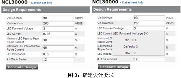 如上所述,進入NCL30000的設計頁面后,需要根據具體應用,針對性地選定設計要求,如最小及最大輸入電壓、LED正向壓降、LED電流、LED阻抗、串聯LED數量等等(見圖3左側)。相關數值的單位已經確定,列在輸入框的右側,需注意避免混淆數值單位。