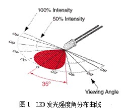 LED的發(fā)光強(qiáng)度隨觀察角度的變化而變化,從不同角度觀察LED發(fā)光管,它的發(fā)光強(qiáng)度有很大差別。發(fā)光強(qiáng)度的大小由LED發(fā)光管自身的發(fā)光強(qiáng)度角分布曲線(xiàn)決定,其分布曲線(xiàn)如圖1所示。LED光軸方向相對(duì)發(fā)光強(qiáng)度(即發(fā)光強(qiáng)度與最大發(fā)光強(qiáng)度的之比)為1,即發(fā)光強(qiáng)度最大。離開(kāi)光軸方向的角度越大,相對(duì)發(fā)光強(qiáng)度越小。由圖1可以估算出該LED的半值角,視角值為。