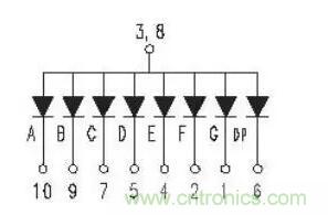 單位數(shù)碼管有十個(gè)管腳,其中有8根是用來點(diǎn)亮a,b,c,d,e,f,dp 共8個(gè)發(fā)光二極管(原理中有介紹),3,8兩個(gè)管腳為公共COM腳,它們相連通且作用相同,可接任意一根。為了更清楚介紹,貼圖如下
