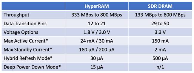 表:HyperRAM 與單數(shù)據(jù)速率 (SDR) DRAM 的比較。[*注意:比較是使用 64Mb 設(shè)備作為基礎(chǔ)。](:Infineon Technologies)