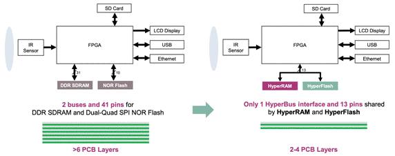 圖 1:(左)使用外部 DDR SDRAM 和 NOR 閃存的相機(jī)需要兩條總計(jì) 41 個(gè)引腳的內(nèi)存總線,從而將 PCB 層數(shù)增加到六層或更多。(右)使用 HyperRAM 和 HyperFlash 作為外部存儲(chǔ)器的相機(jī)可以通過(guò) 13 個(gè)引腳的單總線進(jìn)行通信,并且只需要兩到四個(gè) PCB 層。(:英飛凌科技)