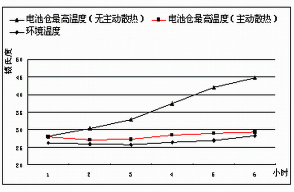 因此戶外電源設(shè)計(jì)中針對(duì)電池倉(cāng)的環(huán)境控制非常關(guān)鍵。尤其在高溫環(huán)境中要有針對(duì)性的散熱措施,研究表明,傳統(tǒng)的自然開孔散熱難以滿足電池的應(yīng)用要求。在傳統(tǒng)的自然開孔散熱條件下,雖然蓄電池自身發(fā)熱量較小,但隨著環(huán)境溫度的升高,在蓄電池倉(cāng)中的熱累積會(huì)逐步的升高電池倉(cāng)的溫度,在太陽照射的條件下情況更為嚴(yán)重。如圖6所示,在自然散熱條件下(倉(cāng)內(nèi)無主動(dòng)散熱措施),電池倉(cāng)內(nèi)溫度會(huì)遠(yuǎn)高于環(huán)境溫度。在同樣的條件下,采用主動(dòng)散熱技術(shù),電池倉(cāng)內(nèi)溫度基本接近于環(huán)境溫度,電池工作條件會(huì)得到極大改善。根據(jù)此項(xiàng)研究結(jié)果,艾默生開發(fā)了電池倉(cāng)獨(dú)立風(fēng)道散熱技術(shù),保證了電池倉(cāng)的充分散熱,極大的改善了電池工作溫度,提高了電池壽命。