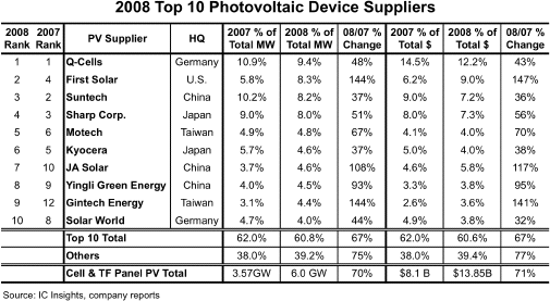 供應(yīng)量位居第三的是上年排名第二的尚德太陽能電力有限公司(Suntech Power Holdings),上年排名第三的夏普以與尚德的0.2個百分點(diǎn)之差下滑至第四。不過,在銷售額方面夏普位居第三,尚德以0.1個百分點(diǎn)之差退居第四。IC Insights評價夏普的薄膜硅太陽能電池增產(chǎn)及擴(kuò)大銷售的計劃“很有野心”,并預(yù)測如果按照計劃推進(jìn),夏普將有望盡快奪回市場份額。