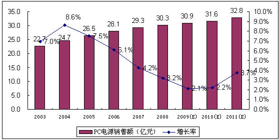 - 2009年中國(guó)PC電源市場(chǎng)的增長(zhǎng)率將進(jìn)一步下降,銷售規(guī)模同比增長(zhǎng)3.8%,銷售額同比增長(zhǎng)2.1%