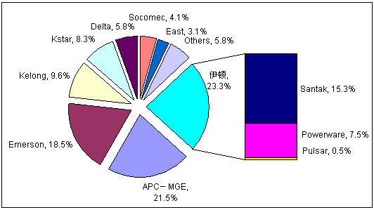 2006年以來,中國(guó)UPS市場(chǎng)開始了廠商之間一系列的并購整合,競(jìng)爭(zhēng)格局開始重新洗牌,直到2008年,新的格局才基本確立。目前,市場(chǎng)第一陣營(yíng)被國(guó)際三巨頭伊頓、施耐德、艾默生占據(jù),市場(chǎng)份額達(dá)到63.3%。而科華、科士達(dá)這兩個(gè)國(guó)內(nèi)自主品牌廠商也憑借良好的發(fā)展?fàn)顟B(tài)和合理的市場(chǎng)策略脫穎而出,躋身UPS市場(chǎng)的第二陣營(yíng)。