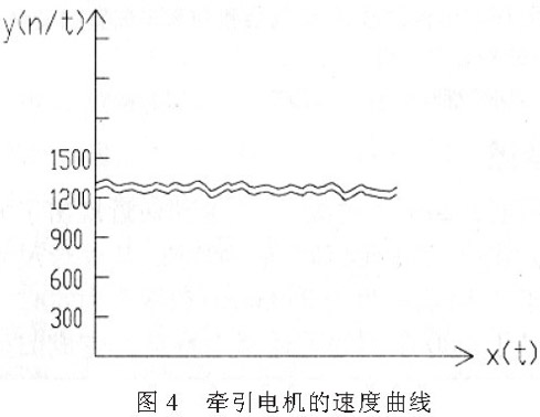 利用 STEP7 編制PLC 上位機監(jiān)控程序,Wincc采集速度值并繪制曲線。數(shù)據(jù)提取的時間間隔為15ms。實際上牽引電機1 和牽引電機2 速度是相同的, 但為了反映牽引電機2 的跟蹤和波動情況, 在此特地將其分開, 上面是牽引電機1 的速度曲線, 下面是牽引電機2 的速度曲線(見圖4) 。牽引電機1 的速度發(fā)生變化時, 牽引電機2 就能及時地響應(yīng), 進行跟蹤, 并且能很快地達到穩(wěn)定。實驗表明, 采用PLC 和變頻器的控制方法, 能達到較高的同步要求, 響應(yīng)快、速度波動幅度較小。
