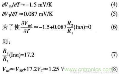 其中,VBE具有負(fù)溫度系數(shù),VT具有正溫度系數(shù),這樣,通過調(diào)節(jié)n和R2/R1,就可以使Vref得到一個零溫度系數(shù)的值。一般在室溫下,有: