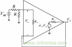 由于緩沖器本身 β = 1,因此輸出電壓 VREF 等于 AOLVIN。VREF 流入緩沖放大器反相輸入端的輸入偏置電流,決定了負(fù)載電流的大小程度。這一點(diǎn)非常重要,因?yàn)樨?fù)載電流的大小會(huì)調(diào)節(jié)環(huán)路增益 (AOLβ) 和閉環(huán)輸出阻抗 ROUT。