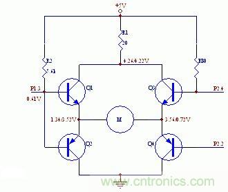 但實際實驗情況去出人意料,即電機正向和反向都不轉(zhuǎn)。經(jīng)測量,當(dāng)P1.3高電平,P2.2和P2.4都為低電平時,Q4導(dǎo)通,但Q1不導(dǎo)通,P1.3的電平只有0.67V左右,這樣Q1無法導(dǎo)通。