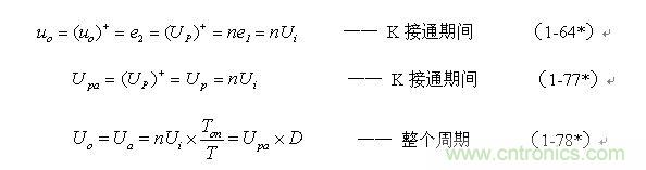 我們從(1-77)和(1-78)兩式可知,改變控制開關(guān)K的占空比D,只能改變輸出脈沖電壓(圖1-16-b中正半波)的平均值Ua,而輸出脈沖電壓的幅值Up不變。因此,正激式變壓器開關(guān)電源用于穩(wěn)壓電源,只能采用改變正激變壓器次級線圈輸出脈沖電壓的平均值的方式,然后再經(jīng)濾波輸出直流電壓。