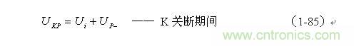 根據(jù)圖1-17,加到開關(guān)器件(控制開關(guān))兩端的峰值電壓UKP正好等于輸入電壓Ui與反電動勢峰值Up-之和,即: