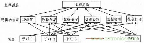 我們采用自頂向下的設(shè)計(jì)方式,將系統(tǒng)分為3層:主界面層、邏輯功能層和底層。“主界面層”主要包括主人機(jī)界面和系統(tǒng)總體控制。“邏輯功能層”負(fù)責(zé)系統(tǒng)的各種邏輯功能,例如I/O設(shè)置、數(shù)據(jù)采集、數(shù)據(jù)處理、數(shù)據(jù)管理和數(shù)據(jù)查詢等。“底層”則是一個(gè)個(gè)按照基本功能劃分子VI,供給高層次VI調(diào)用。采用調(diào)用子VI的形式來(lái)實(shí)現(xiàn)模塊之間的調(diào)用和關(guān)聯(lián)。當(dāng)調(diào)用子VI時(shí),系統(tǒng)需要花費(fèi)很少的開(kāi)銷(xiāo),大概幾十毫秒的時(shí)間。測(cè)試系統(tǒng)的軟件層次結(jié)構(gòu)圖3所示。