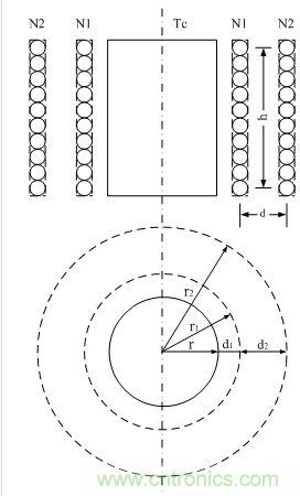 在圖2-30中,N1、N2分別為變壓器的初、次級(jí)線圈,Tc是變壓器鐵芯。r是變壓器鐵芯的半徑,r1、r2分別是變壓器初、次級(jí)線圈的半徑;d1為初級(jí)線圈到鐵芯的距離,d2為初、次級(jí)線圈之間的距離。為了分析計(jì)算簡單,這里假設(shè)變壓器初、次級(jí)線圈的匝數(shù)以及線徑相等,流過線圈的電流全部集中在線徑的中心;因此,它們之間的距離全部是兩線圈之間的中心距離,如虛線所示。