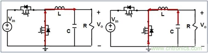 這種效率最低的操作模式適合于一些特定的應(yīng)用。在該模式中,輸出可以供電流也可以吸收電流,因此可以應(yīng)用于DDR存儲器的供電。另外,在一些通訊系統(tǒng)中,即使是在輕負(fù)載的條件下仍然需要低的輸出電壓紋波,因此也必須使用此種工作模式,而效率并不是主要的考慮因素。輸出紋波電壓和頻率在整個負(fù)載變化范圍內(nèi)恒定,容易濾除噪聲,適合于通訊等要求干擾噪聲低的應(yīng)用。在強(qiáng)制連續(xù)模式操作中輸出電流倒灌,然后處于開關(guān)管死區(qū)時間,電感的電流對輸入電容充電,其電壓提升,設(shè)計(jì)時要校核實(shí)際的輸入電壓最大值,使其小于相關(guān)元件的額定值。
