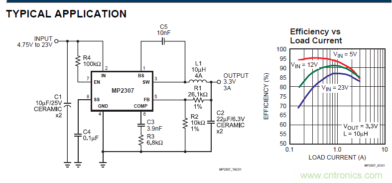 基本電路圖左,效率曲線圖右,性能看上去還是非常不錯的。