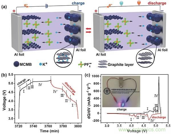 近日,中科院深圳先進技術(shù)研究院唐永炳研究員(通訊作者)課題組在Adv. Energy Mater.上發(fā)表了一篇名為“A Dual-Carbon Battery Based on Potassium-Ion Electrolyte”的文章。研究人員開發(fā)了基于鉀離子電解液的新型雙碳電池(命名為K-DCB),其中中間相碳微球作為負極材料,膨脹石墨作為正極材料。實驗人員研究了K-DCB的工作機理:充電時,K+運動到石墨負極并嵌入到石墨層間形成插層化合物,同時PF6-運動到正極,插層到中間相碳微球的層間;放電時則相反。結(jié)果表明,該K-DCB在3.0~5.2V的電壓窗口范圍,1C的電流密度下可以提供61mAh g-1的可逆比容量,并且具有良好的循環(huán)性能,循環(huán)100次后容量幾乎無衰減。此外,該K-DCB具有較高的放電中值電壓(4.5V),能夠滿足一些高電壓設備的要求。K-DCB具有環(huán)保、成本低、能量密度高等優(yōu)點,對未來能源儲存應用極具潛力。