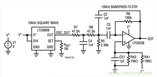 通過把一個(gè)方波驅(qū)動(dòng)至帶通濾波器中可獲得一個(gè)低功 率正弦波發(fā)生器。在圖 3 示出了一個(gè)完整的電路原理 圖。LTC6906 微功率電阻器設(shè)定的振蕩器可容易地配 置為一個(gè) 10kHz 方波,并能驅(qū)動(dòng)帶通濾波器輸入電 阻器中相對溫和的負(fù)載。LTC6906 在 10kHz 時(shí)的電源 電流為 32.4μA。
