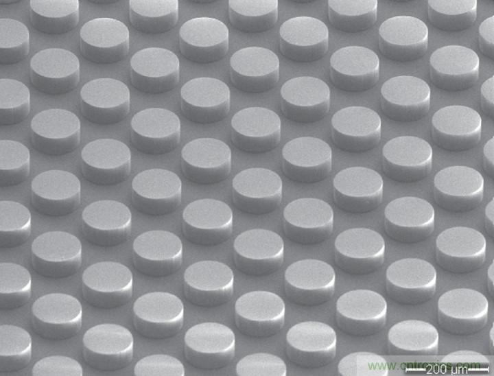 圖1:杜克大學(xué)的無金屬超材料電介質(zhì)有一個(gè)遍布被調(diào)諧成可吸收太赫茲波的小圓柱體的凸凹表面。