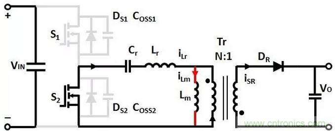 在這個階段,Lr和Cr串聯(lián)諧振,iLr過0后,反向繼續(xù)諧振;然后,經(jīng)過一段時間, iLm也過0,反向激磁繼續(xù)增加。