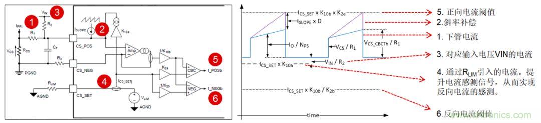 下圖左為LM5036逐周期電流限制的外接電路、LM5036內部實現(xiàn)示意電路。