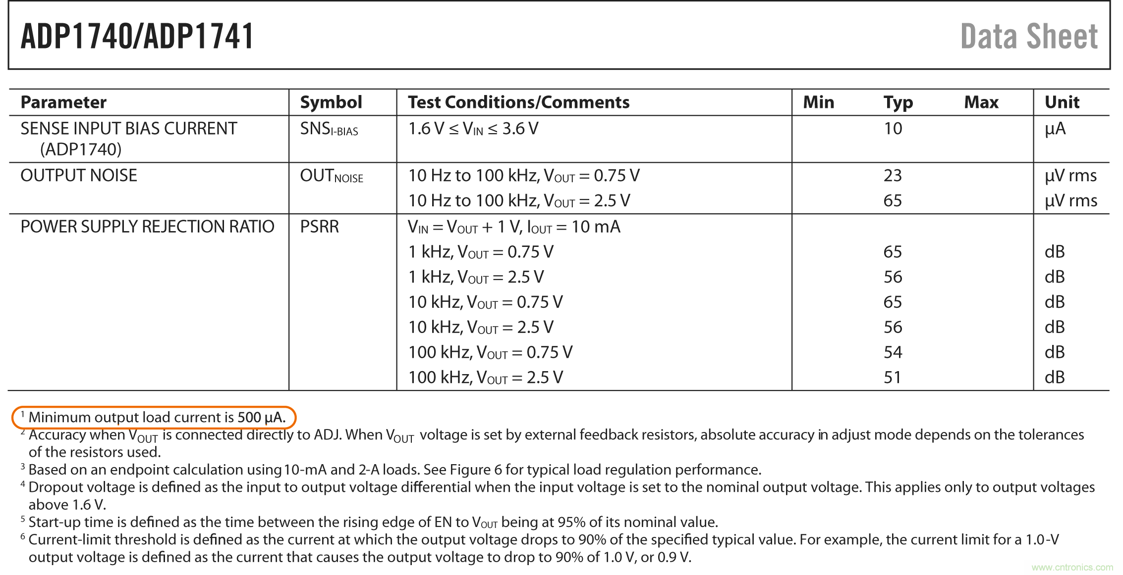 ADP1740 和其他低電壓、高電流 LDO 都屬于這一類。在最糟糕的情況下,集成電源開關(guān)產(chǎn)生的漏電流大約是 100 µA (85°C) 和 500 µA (125°C)。在無負載的情況下,漏電流會對輸出電容充電,直到開關(guān)的 VDS 低到足以將漏電流減小至可以忽略不計的水平,同時增加空載輸出電壓。數(shù)據(jù)手冊指出,至少需要 500 µA 的負載,因此,如果器件要在高溫下工作,則建議使用仿真負載。該負載小于設(shè)備的額定值 2 A。圖 B 顯示了 ADP1740 數(shù)據(jù)手冊中列出的最小負載電流規(guī)格。