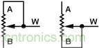 digiPOT有兩種使用模式,即電位計(jì)模式或可變電阻器模式。圖1所示為電位計(jì)模式,此時(shí)有3個(gè)端子,信號(hào)通過(guò)A端和B端連接,W端(類(lèi)似游標(biāo))則提供衰減的輸出電壓。當(dāng)數(shù)字比率控制輸入為全零時(shí),游標(biāo)通常與B端連接。