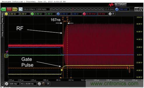 實(shí)測(cè)開啟時(shí)間如圖4所示。時(shí)間標(biāo)度為每格500 ns,RF信號(hào)的上升時(shí)間小于200 ns。對(duì)于測(cè)量從柵極脈沖開始到RF脈沖上升沿結(jié)束的時(shí)間的系統(tǒng),可以看到開啟時(shí)間約為300 ns,這說明系統(tǒng)分配1 μs用于發(fā)射到接收轉(zhuǎn)換會(huì)有相當(dāng)可觀的裕量。