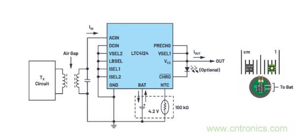 圖3. 在6 mm應(yīng)用電路板上使用LTC4124的完整無線電池充電器解決方案