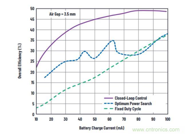 因為發(fā)射功率始終匹配接收器的需求,所以與無閉環(huán)控制的基于LTC4124和LTC4125的無線充電器典型配置相比,整體效率得到大幅提高。由于沒有采用LTC4125原本的最佳功率搜索模式,因而不產(chǎn)生DAC的步進(jìn)效應(yīng),該配置的效率曲線更加平穩(wěn)。由于功率損耗大幅降低,所以LTC4124充電器和電池在整個充電期間始終保持接近室溫的狀態(tài)。