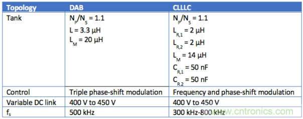 表3具有換向電感器(LC)值的DAB和CLLLC設(shè)計(jì)