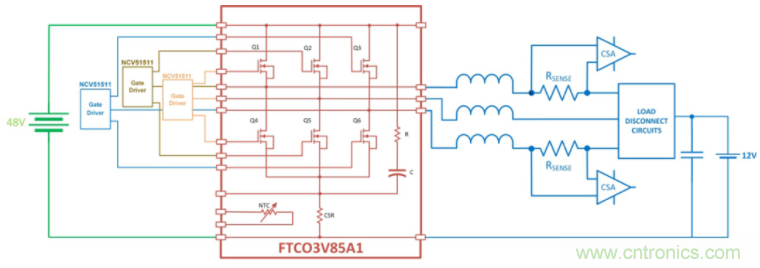 安森美半導(dǎo)體的這款集成式功率模塊采用符合AEC要求的小型封裝,具有低熱阻、低內(nèi)部電阻和更高的EMI性能。該實(shí)現(xiàn)中未使用電源斷路電路;對于個(gè)別的相位隔離,可以使用負(fù)載斷路電路。
