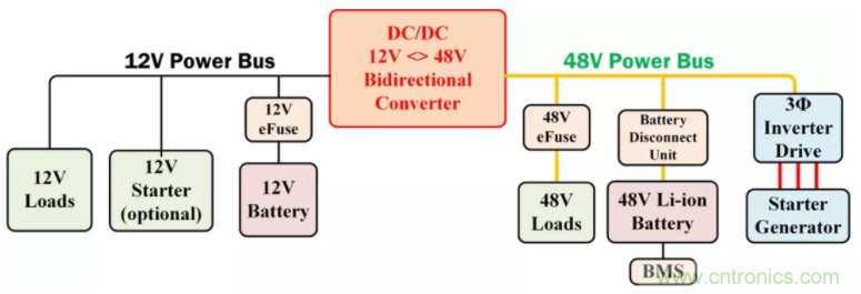 除了沒有12 V交流發(fā)電機(jī),系統(tǒng)的12 V電池部分保持原樣。由于ICE中沒有12 V電源發(fā)電機(jī),因此需要使用雙向轉(zhuǎn)換器實(shí)現(xiàn)48 V系統(tǒng)與12 V系統(tǒng)之間的電源轉(zhuǎn)換。