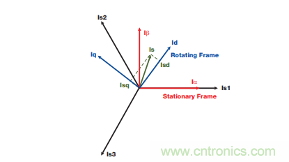圖 2. 定子電流矢量去耦為扭矩和通量分量,以執(zhí)行磁場(chǎng)定向控制。